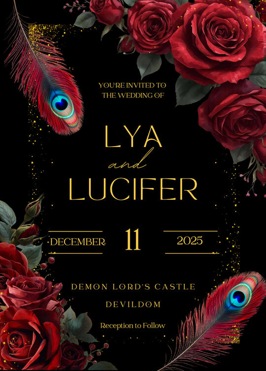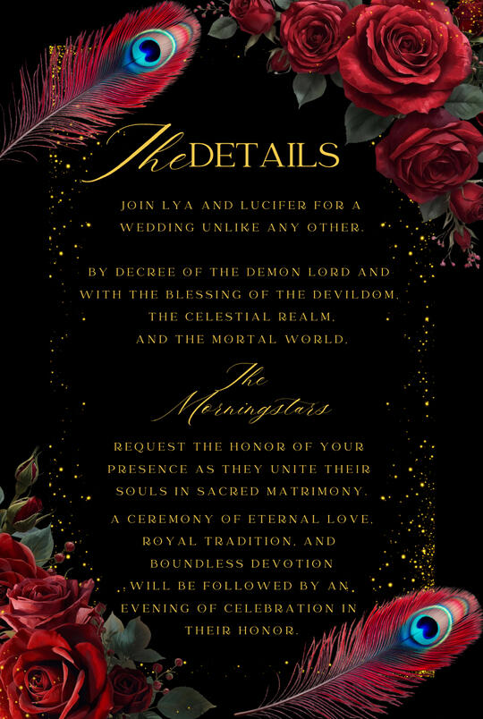 You are warmly invited to the sacred union of Lya Rose and Lucifer Morningstar. A celebration of devotion forged in trials, trust, and timeless love. Their bond will be sealed in the presence of those they hold dear across the Devildom, the Celestial Realm, and the human world alike. This ceremony is not merely an event, but a vow to their eternity.